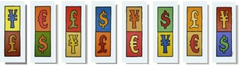 POP-ART 8Acryl auf Leinwand/KünstlerspachtelmasseMischtechnikdie Währungszeichen sind erhaben mit Strukturmasse gestaltet 8 mal 20 x 50